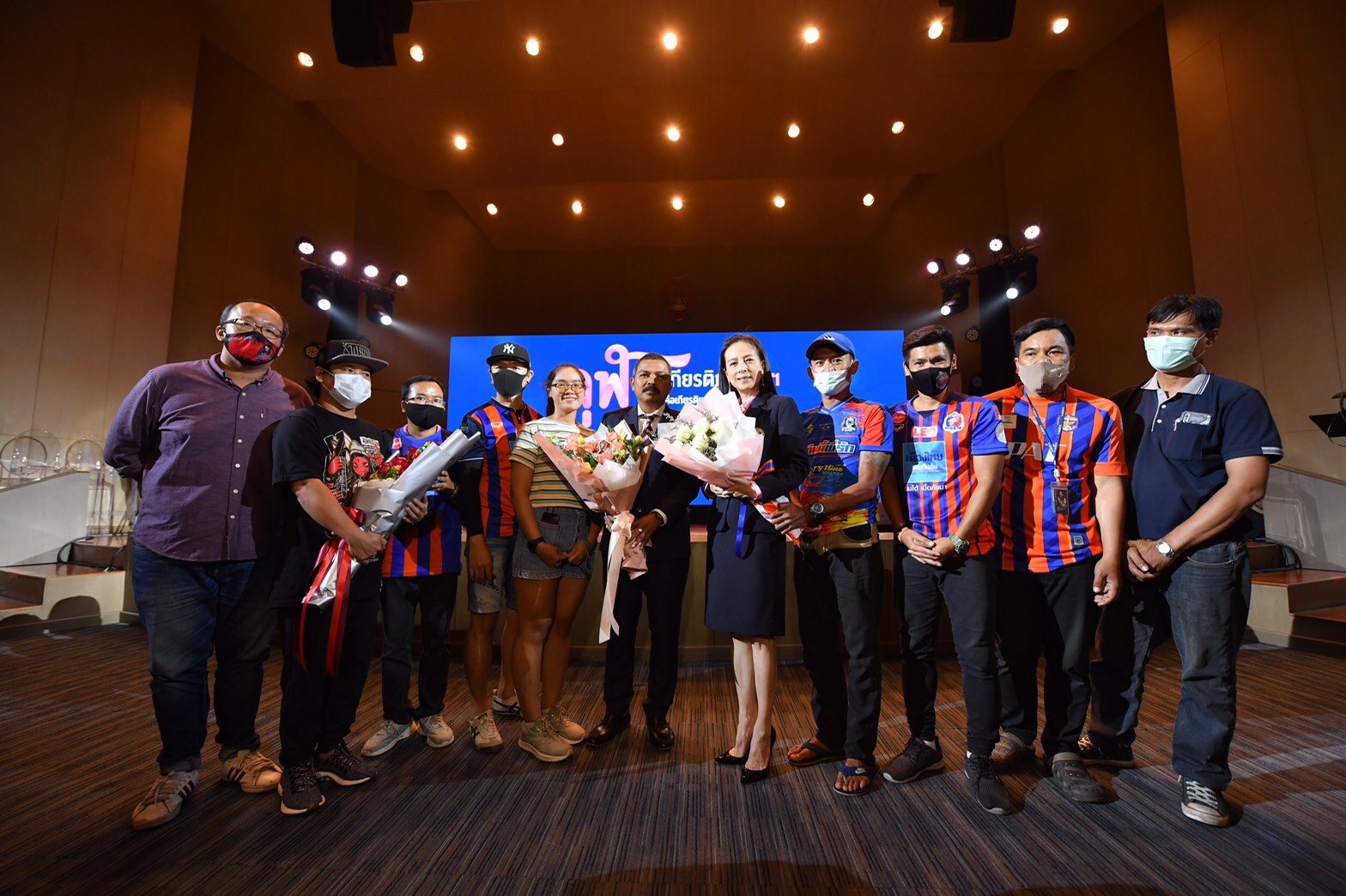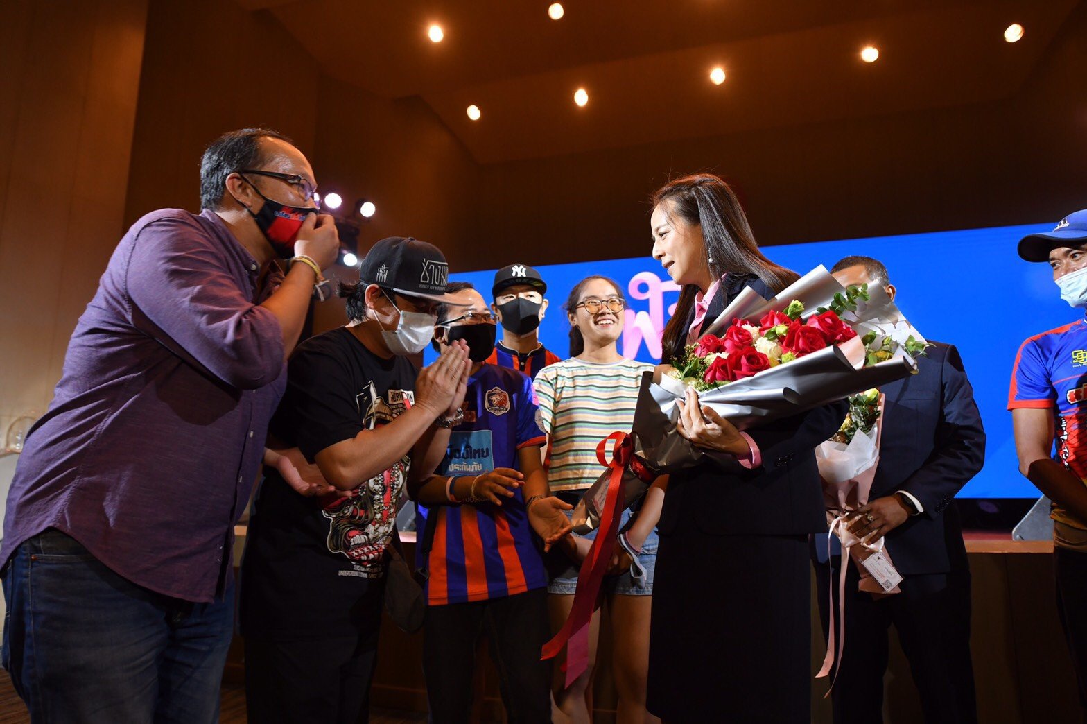 แฟนบอลสโมสรการท่าเรือ เอฟ.ซี. ร่วมมอบดอกไม้ให้กำลังใจ “มาดามแป้ง” นวลพรรณ ล่ำซำ หัวเรือใหญ่ทัพ “สิงห์เจ้าท่า”